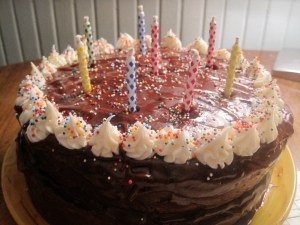 I served the mushroom burgers with a side of garlic green beans. They looked a little wilted, but they still tasted good!Here's a concoction I came up with myself: Bow tie pasta with arugula, red peppers, goat cheese, pine nuts and pesto. Yum.This is supposedly "the best birthday cake ever," according to the recipe. I'm not sure I would give it such a high accolade, but it certainly tasted good. Next time, I would make each layer a little thinner.